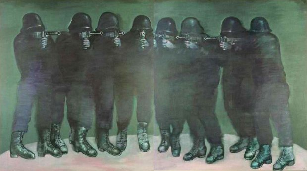 Cuando estábamos colgando la exposición en las salas del Museo, llegó un grupo de hombres del servicio de inteligencia a inspeccionar las obras. Luego de recorrer las salas se volvieron hacia a Linares pidiéndole una explicación sobre la pintura del fusilamiento. Podría haberles dado, como cuenta la historia, la misma respuesta que Picasso les dio a los oficiales del ejército nazi que habían invadido Paris mientras miraban la pintura Guernica, y le preguntaron: “¿Esto lo hizo usted?”, a lo que Picasso respondió: “No, esto lo hicieron ustedes”. Pero ante las miradas atónitas del Director del Museo y de mí mismo, Linares les contestó con un tono ingenuo pero firme: “Mire usted, Goya pintó su fusilamiento, Manet pinto el suyo y yo me dije; ‘Yo quiero pintar el mío’”. En lugar de la confrontación eligió contestarles en clave absurda. Cómo dándonos una orden nos dijeron que termináramos de colgar la exposición y salieron del museo.